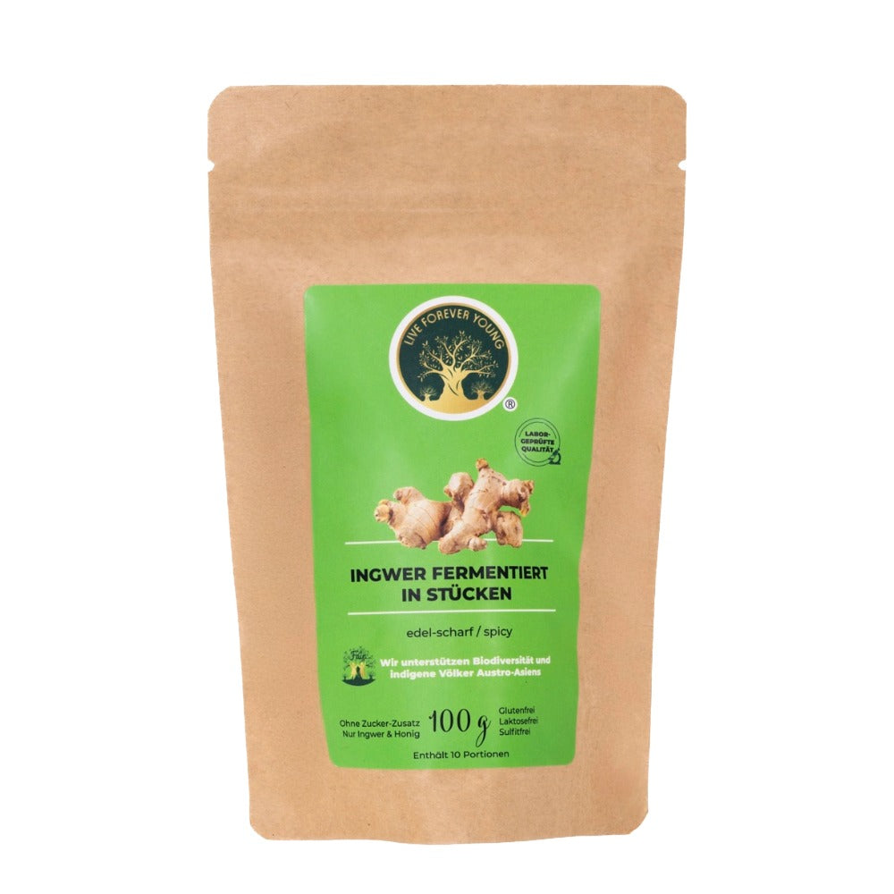 Unser fermentierter Ingwer wird nach einem traditionellen Verfahren der inneren Fermentation über mehrere Monate schonend gereift. Dabei entfaltet er seine charakteristische, angenehme Schärfe sowie ein tiefes, ausgewogenes Aroma. Durch die Fermentation entstehen bioaktive Pflanzenstoffe, die den Ingwer besonders bekömmlich machen und das allgemeine Wohlbefinden unterstützen können. Ideal als bewusster Snack oder als vielseitige Zutat in der Küche.