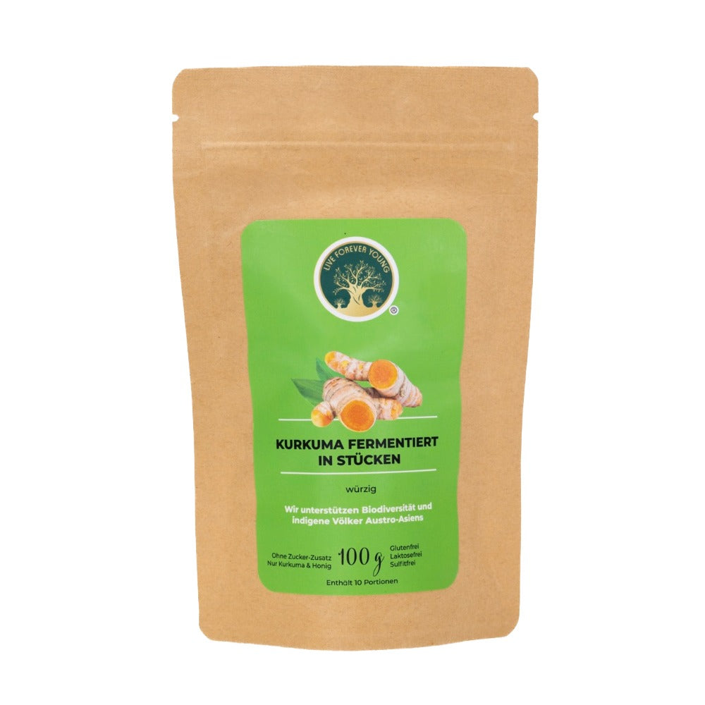 Fermentierte Kurkuma entsteht durch einen natürlichen Fermentationsprozess, bei dem Mikroorganismen die Wurzel über mehrere Monate schonend reifen lassen. Durch diese Verarbeitung werden bioaktive Verbindungen gebildet, die die Bekömmlichkeit und Nährstoffverfügbarkeit erhöhen. Im Vergleich zu ungekochter Kurkuma hat fermentierte Kurkuma ein intensiveres Aroma und eine andere Geschmacks- und Wirkstoffstruktur.