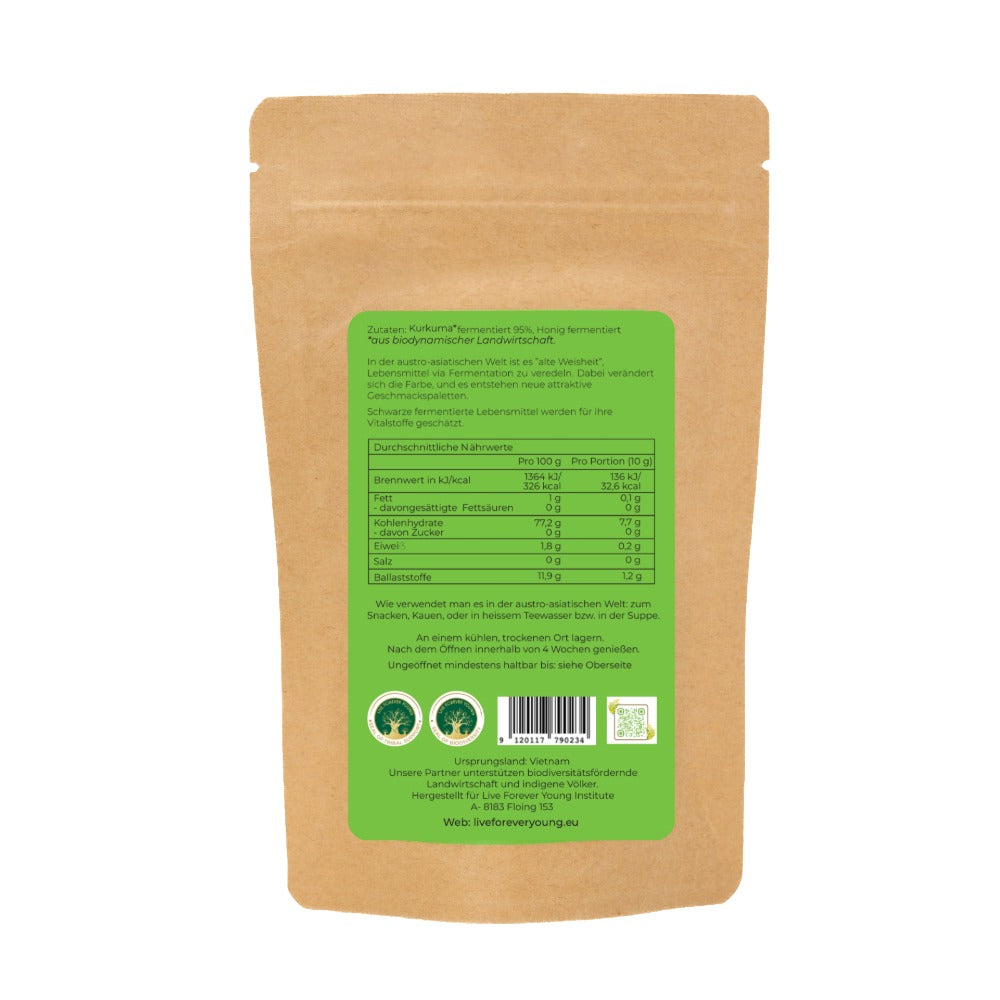 Die verwendeten Kurkumawurzeln stammen aus natürlichem Anbau und werden sorgfältig ausgewählt. Die dunkle Färbung nach drei bis vier Monaten Fermentation ist ein Qualitätsmerkmal dieses Reifeprozesses. Fermentierte Kurkuma lässt sich vielseitig in der Küche einsetzen und bereichert sowohl süße als auch herzhafte Gerichte auf natürliche Weise.